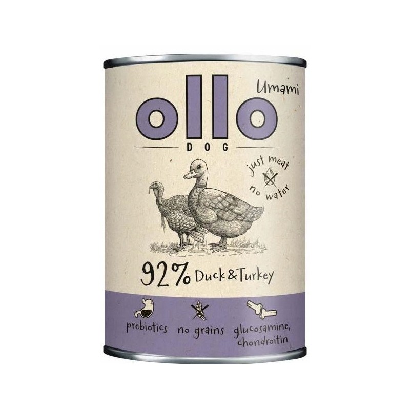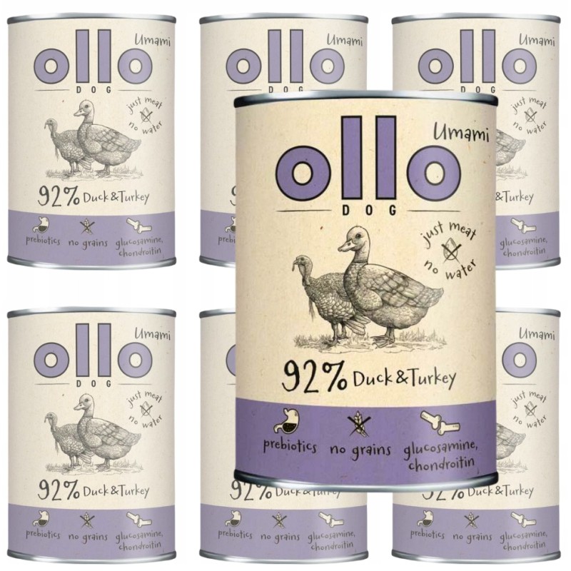 Karma OLLO umami kaczka i indyk to propozycja dla opiekunów, którzy szukają wysokomięsnej, naturalnej karmy mokrej o ograniczonej liczbie składników. Jej jednolita, mięsna tekstura i intensywny zapach są niezwykle atrakcyjne dla większości psów, zachęcając nawet te niechętne do jedzenia. Nadaje się do codziennego żywienia psów dorosłych wszystkich ras.