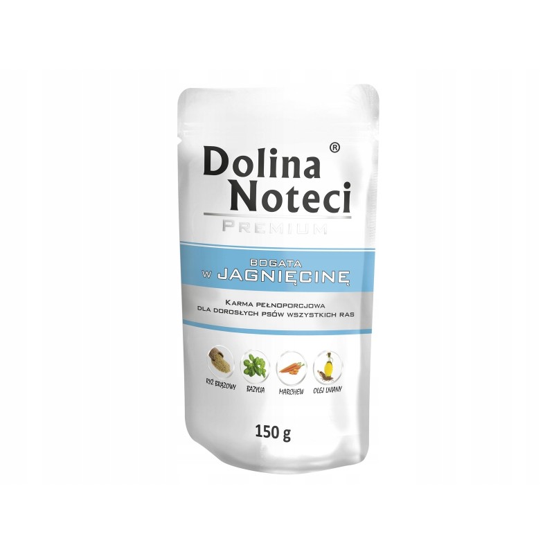 Saszetka DOLINA NOTECI z jagnięciną to praktyczne i zdrowe rozwiązanie dla opiekunów, którzy chcą zapewnić swojemu psu urozmaiconą, mięsną dietę bez kompromisów w kwestii jakości składników. Opakowanie zawiera 1 saszetkę o wadze 150 gramów (SKU: Z2080).