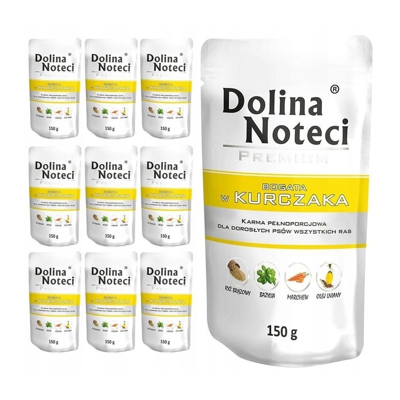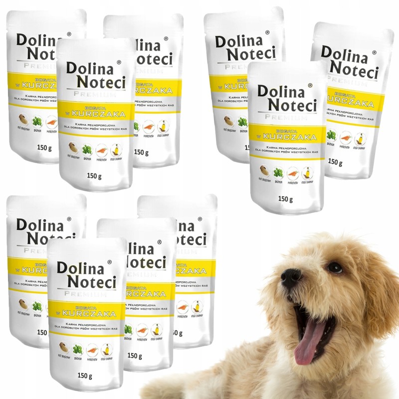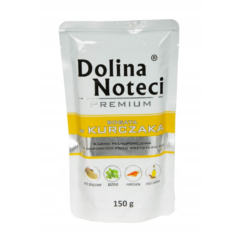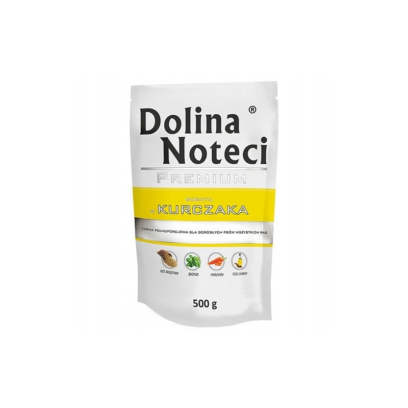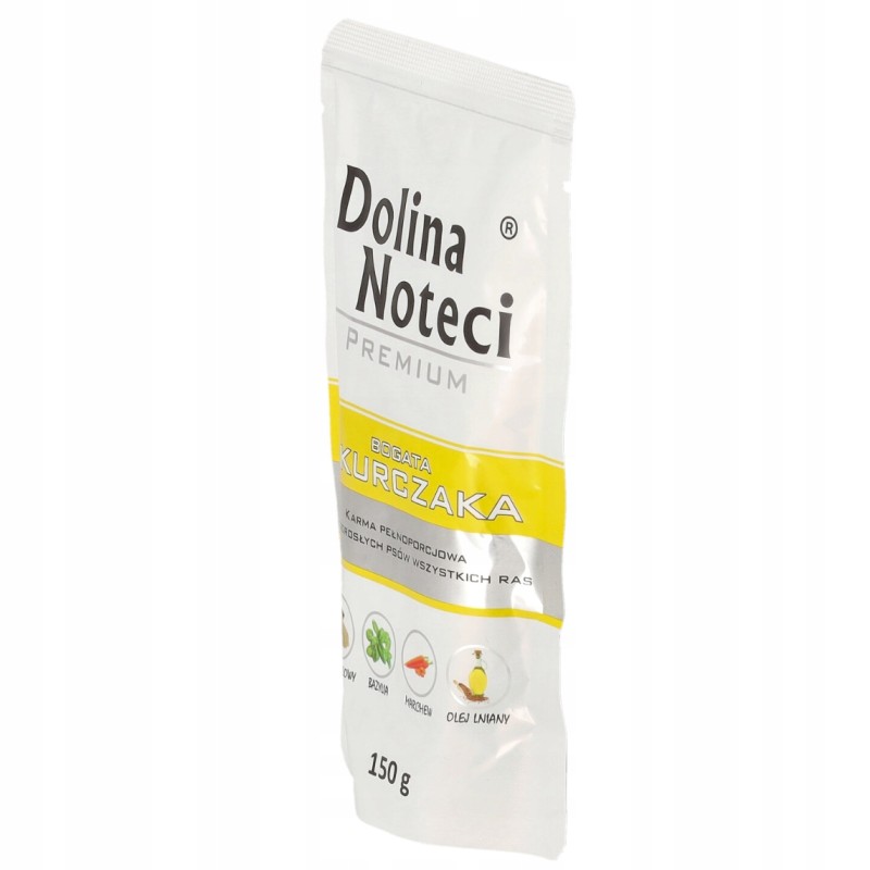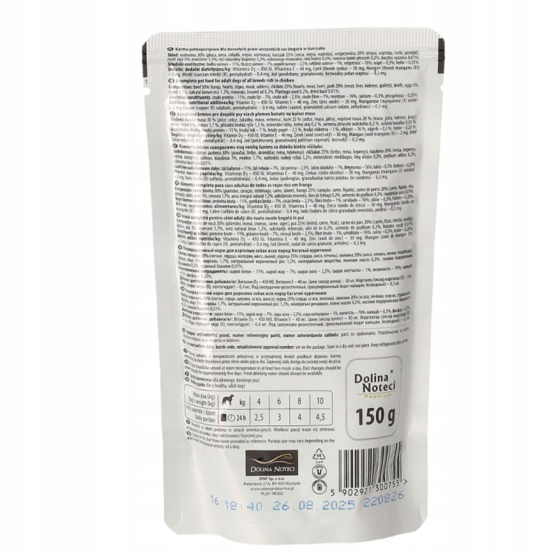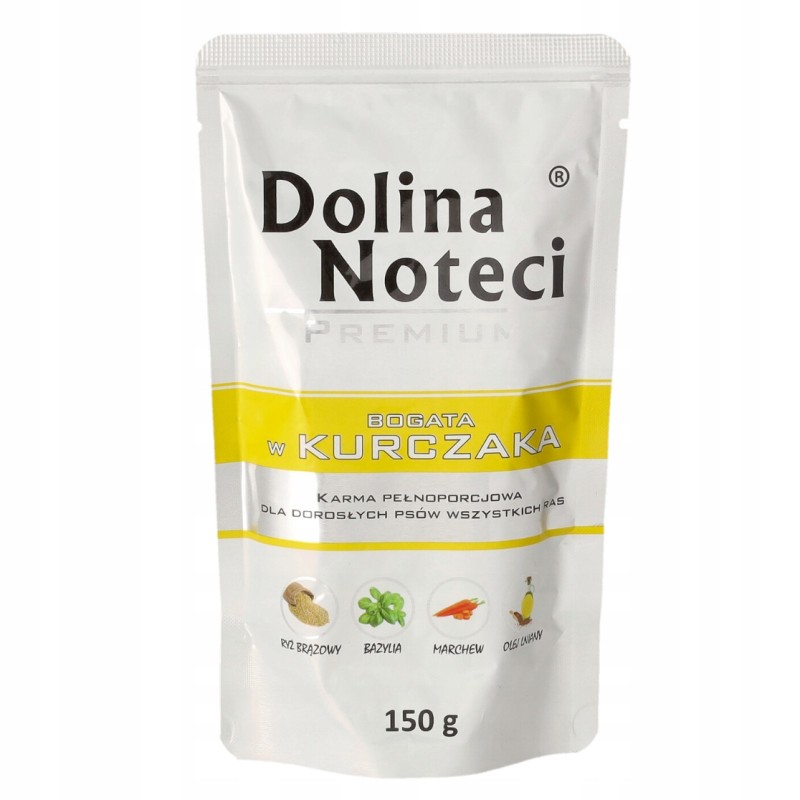 Ta saszetka mokrej karmy dla psów marki Dolina Noteci to pełnoporcjowy, kompletny posiłek, którego głównym źródłem białka jest mięso z kurczaka. Produkt przeznaczony jest dla psów dorosłych wszystkich ras, stanowiąc wygodną formę pożywienia lub smakowite uzupełnienie suchej diety.