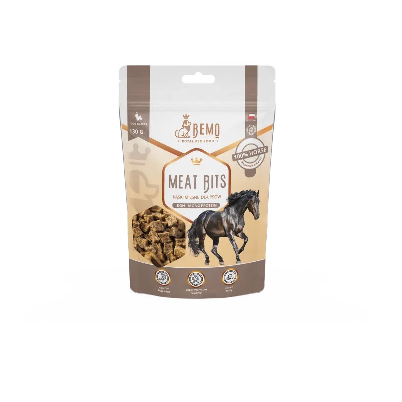 Szukasz wartościowej przekąski, która urozmaici dietę Twojego psa i sprawdzi się jako nagroda podczas szkolenia? Bemo Meat Bits Horse to wysokiej jakości przysmak, którego głównym i jedynym składnikiem mięsnym jest mięso końskie.