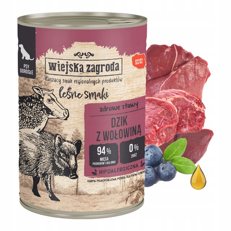 Karma Wiejska Zagroda "Leśne Smaki" to odpowiedni wybór dla opiekunów szukających urozmaiconej, pełnoporcjowej mokrej karmy o prostym, mięsnym składzie. Regularne podawanie wspiera zdrowie i dostarcza psu energii na cały dzień. Pojedyncza puszka stanowi zwykle jeden posiłek dla psa średniej wielkości, a jej zawartość można podawać samodzielnie lub wymieszać z suchą karmą.