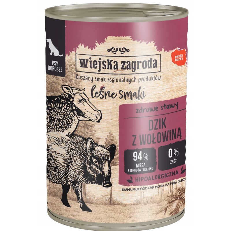 Ta mokra karma dla psów dorosłych marki Wiejska Zagroda to kompletna i zbilansowana dieta w wygodnej formie mięsnych kawałków w sosie. Receptura łączy dwa źródła wysokiej jakości białka zwierzęcego: dziczyznę i wołowinę, co pozwala urozmaicić psi jadłospis i zaspokoić naturalne upodobania smakowe czworonogów.