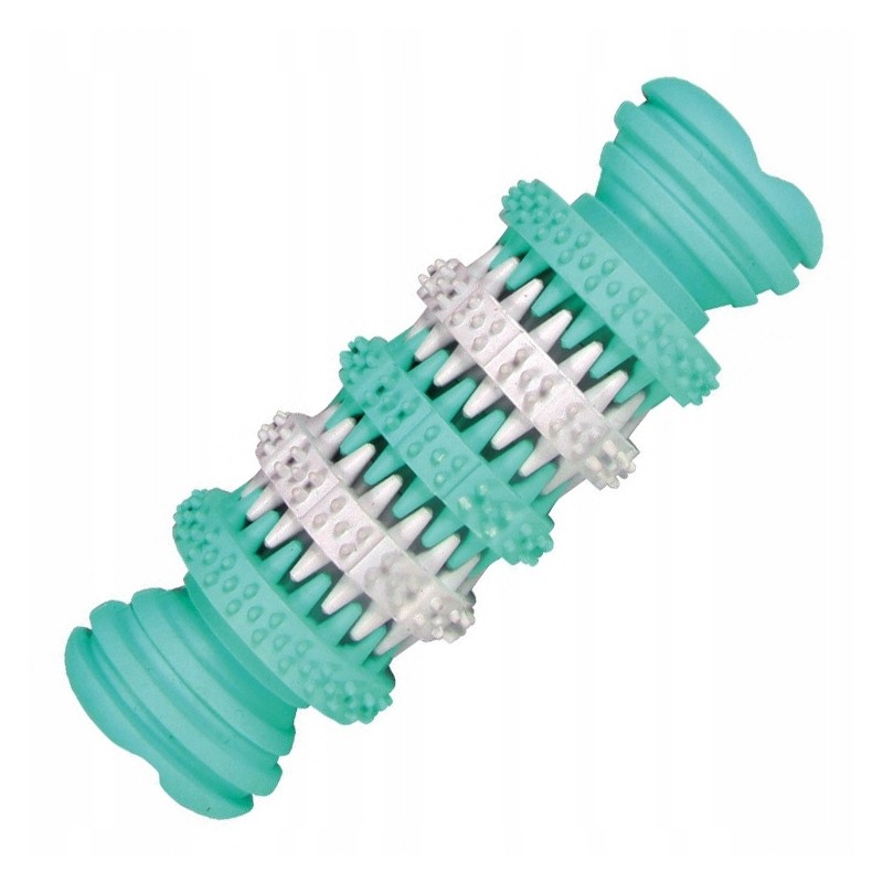 Specjalna, chropowata struktura powierzchni oraz wypustki masują dziąsła i delikatnie ścierają płytkę nazębną, wspierając zdrowie zębów. Dodatek naturalnego, mięciutkiego smaku sprawia, że zabawka jest jeszcze bardziej atrakcyjna dla większości psów, zachęcając je do żucia i gryzienia. To połączenie przyjemnego z pożytecznym.