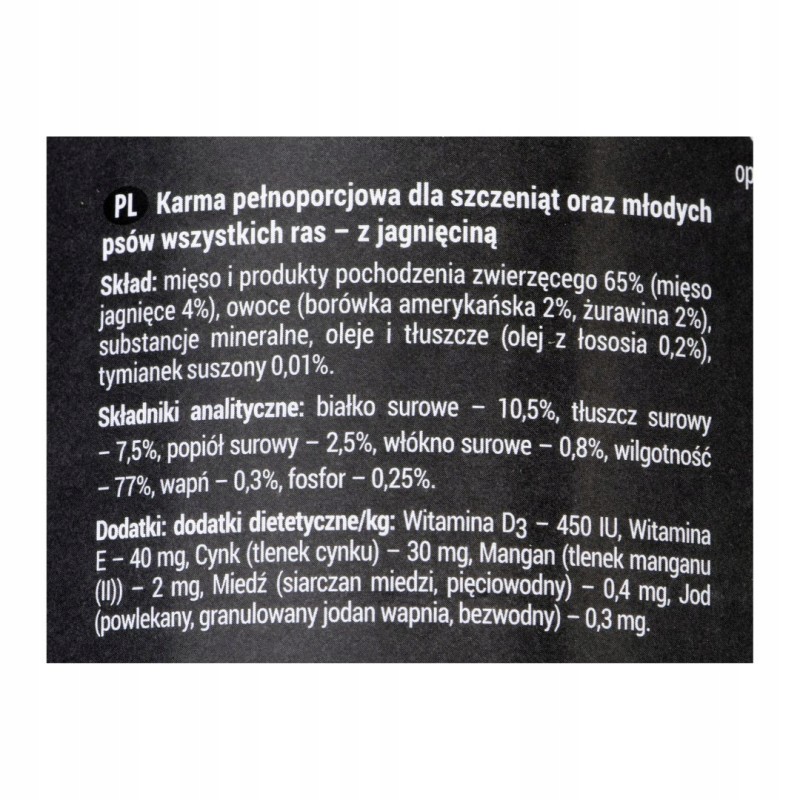 Głównym źródłem łatwo przyswajalnego białka jest delikatne mięso jagnięce, które rzadko powoduje alergie pokarmowe, co jest istotne dla wrażliwych przewodów pokarmowych szczeniąt. Do receptury dodano borówkę i żurawinę – owoce cenione za swoje naturalne właściwości. Żurawina wspomaga zdrowie dróg moczowych, a borówka jest źródłem antyoksydantów. Karma zawiera kompleks niezbędnych witamin (A, D3, E, C, z grupy B) oraz minerałów (jak wapń i fosfor), kluczowych dla budowy mocnych kości i stawów. Dodatek prebiotyków (mannanooligosacharydów i fruktooligosacharydów) pomaga w utrzymaniu prawidłowej mikroflory jelitowej.