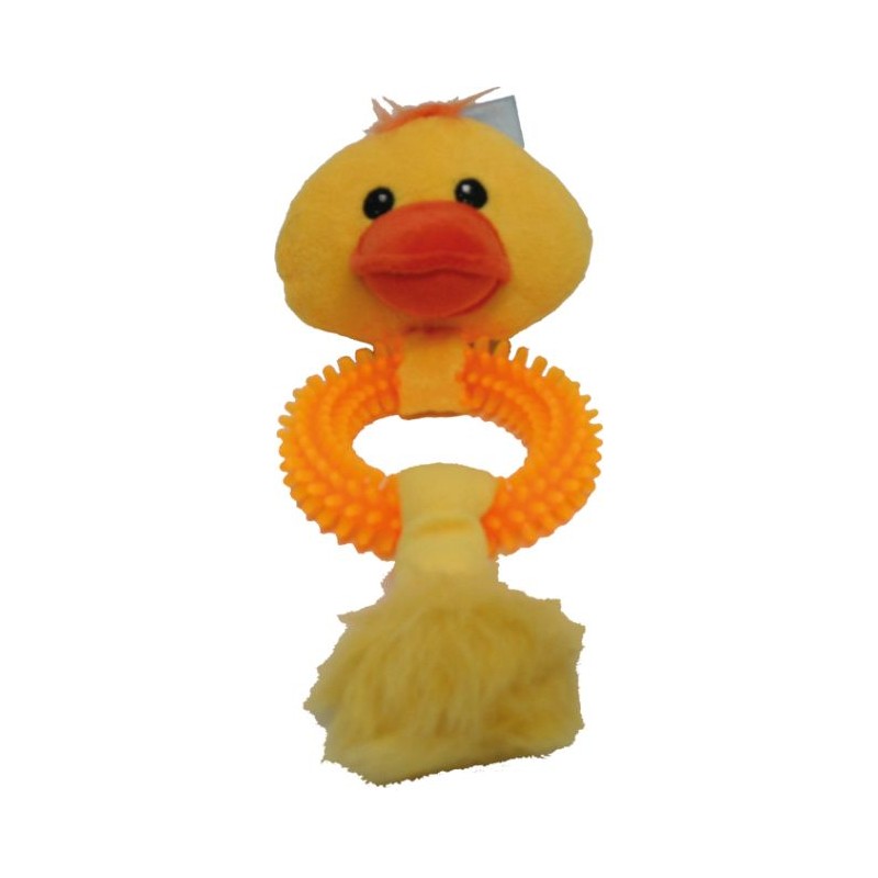 Zabawka "Kaczka z gumowym kółkiem" mierzy 27 cm długości, co czyni ją odpowiednią dla większości czworonogów. Jej żywy, żółty kolor dodatkowo przyciąga uwagę zwierzęcia, angażując zmysł wzroku. To solidna, prosta konstrukcja, która sprawdzi się podczas codziennych zabaw w domu, ogrodzie czy na spacerze, pomagając w budowaniu relacji między opiekunem a pupilem.