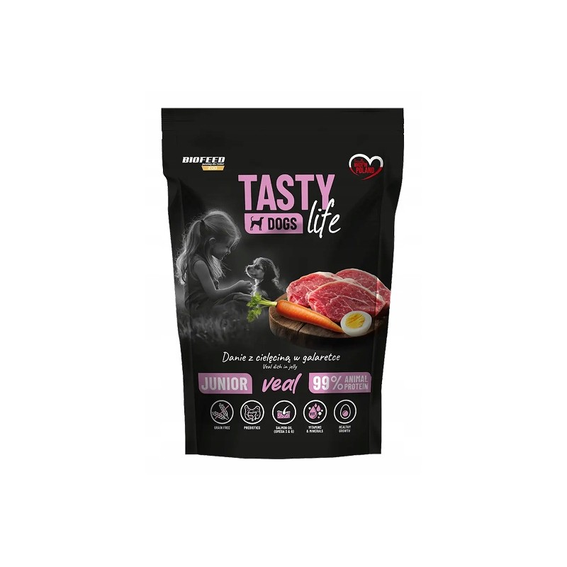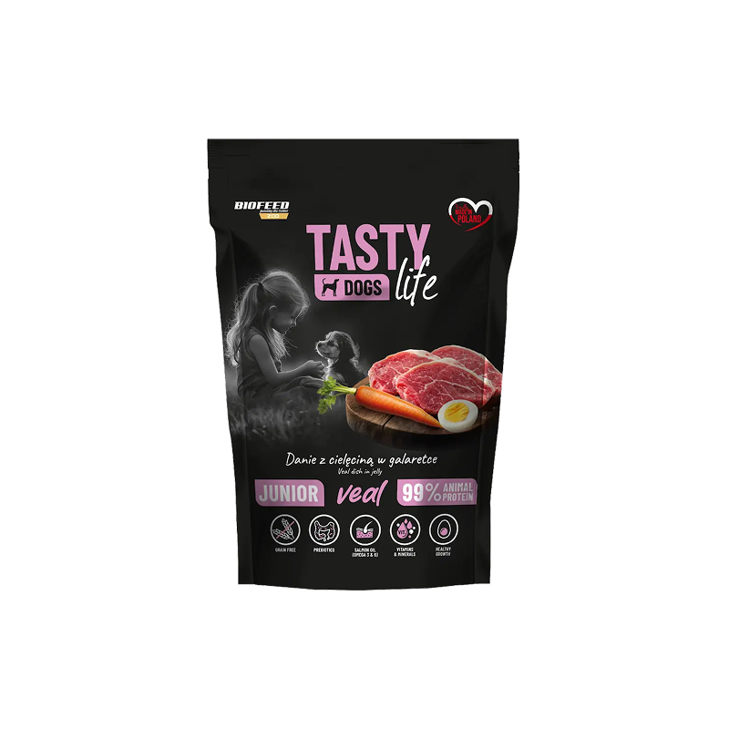 Produkt nie zawiera sztucznych barwników, konserwantów ani wzmacniaczy smaku. Wygodna forma saszetek o wadze 500 g ułatwia precyzyjne dozowanie posiłku. Karmę Biofeed Tasty Dog Life Junior można podawać samodzielnie lub wymieszać z suchą karmą, aby zwiększyć jej atrakcyjność smakową. Zaleca się dostosowanie dziennej porcji do wagi, wieku i poziomu aktywności psa, zgodnie z tabelą żywienia umieszczoną na opakowaniu.