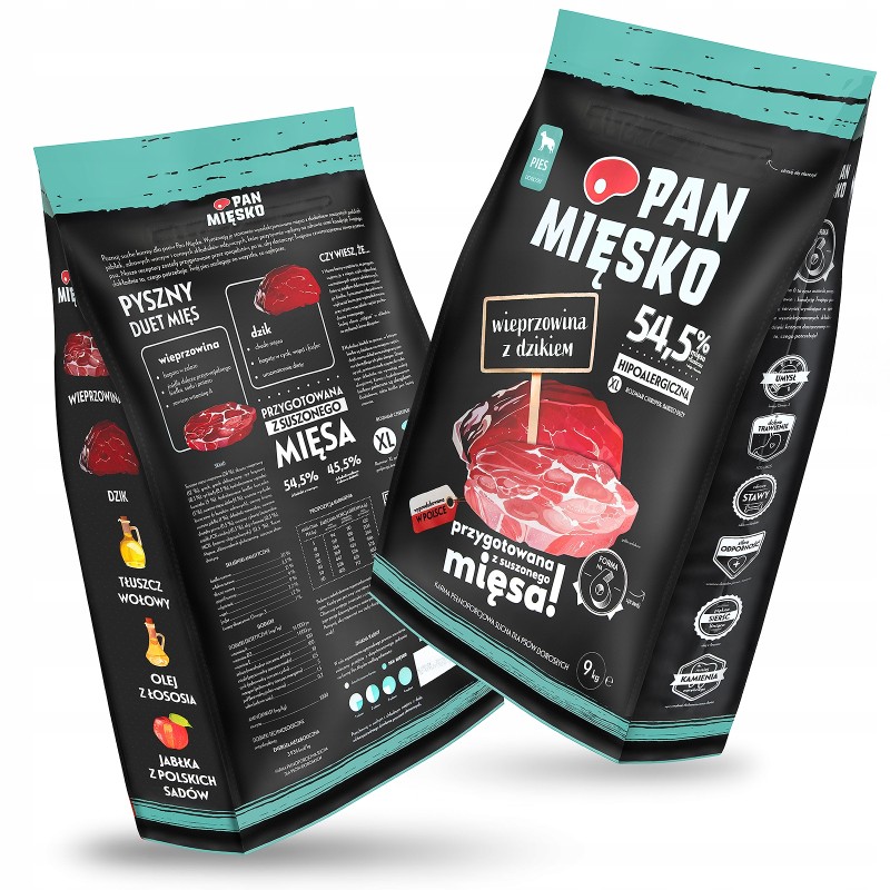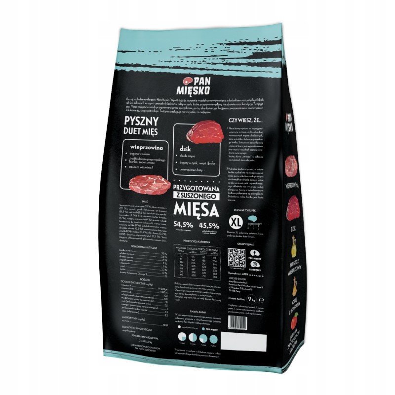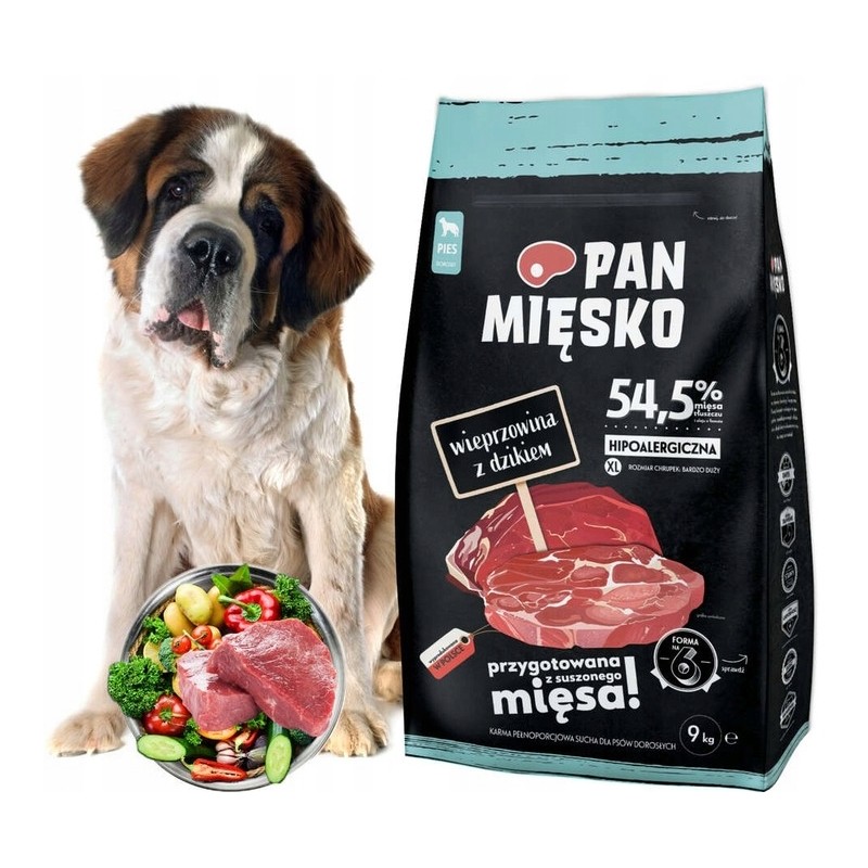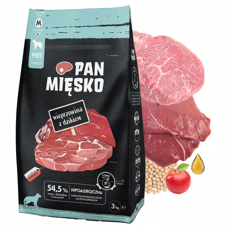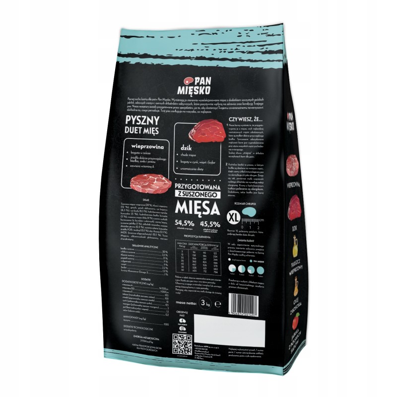 Karma sucha dla psa PAN MIĘSKO w rozmiarze XL to kompletna i zbilansowana formuła stworzona z myślą o potrzebach większych ras psów. Głównym źródłem białka zwierzęcego jest tu wysokiej jakości wieprzowina oraz dziczyzna, które dostarczają niezbędnych aminokwasów dla utrzymania masy mięśniowej i ogólnej witalności.