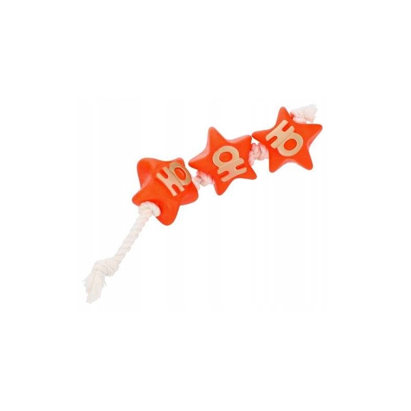 Zabawka została wykonana z wytrzymałych, splątanych sznurów bawełnianych, które są bezpieczne dla dziąseł psa i doskonale sprawdzają się podczas codziennych sesji zabawy w przeciąganie. Wplecione w strukturę miękkie, pluszowe gwiazdki w intensywnym czerwonym kolorze nadają zabawce atrakcyjny wygląd i zapewniają dodatkową stymulację sensoryczną. Całość ma długość około 32 cm, co jest poręcznym rozmiarem dla psów małych i średnich ras.