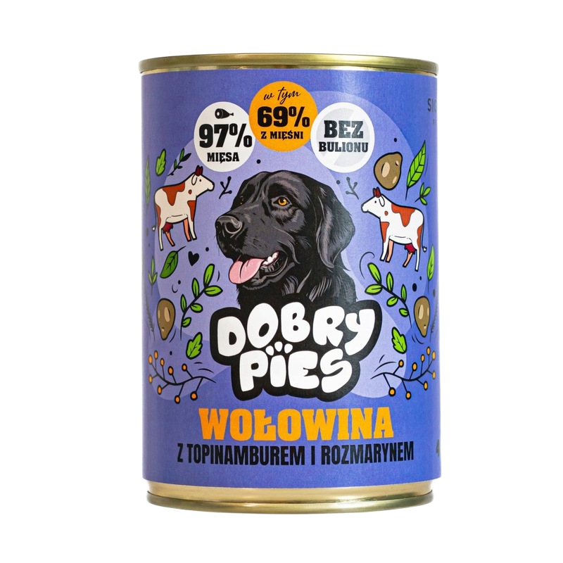 Ta wysokiej jakości karma mokra DOBRY PIES została stworzona z myślą o psach wymagających specjalnej diety lub tych z wrażliwym układem pokarmowym. Głównym i jedynym źródłem białka zwierzęcego jest tu delikatna, łatwostrawna wołowina, która dostarcza niezbędnych aminokwasów.