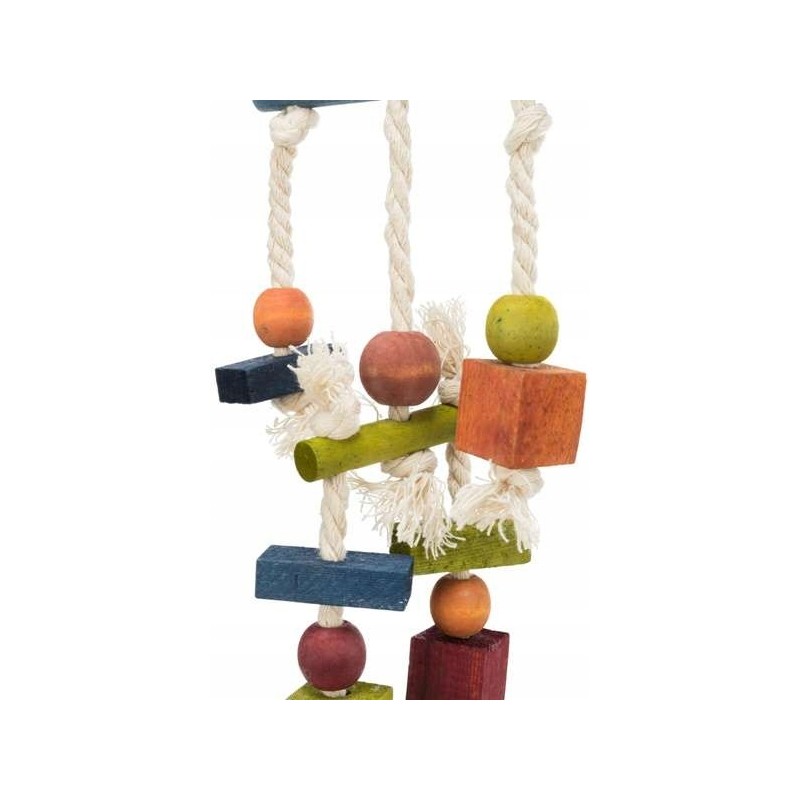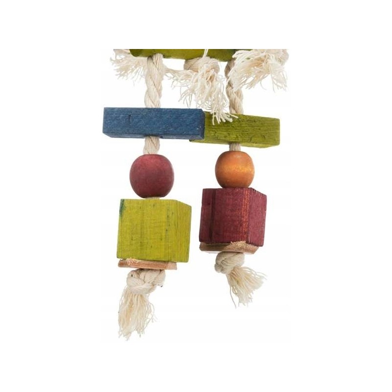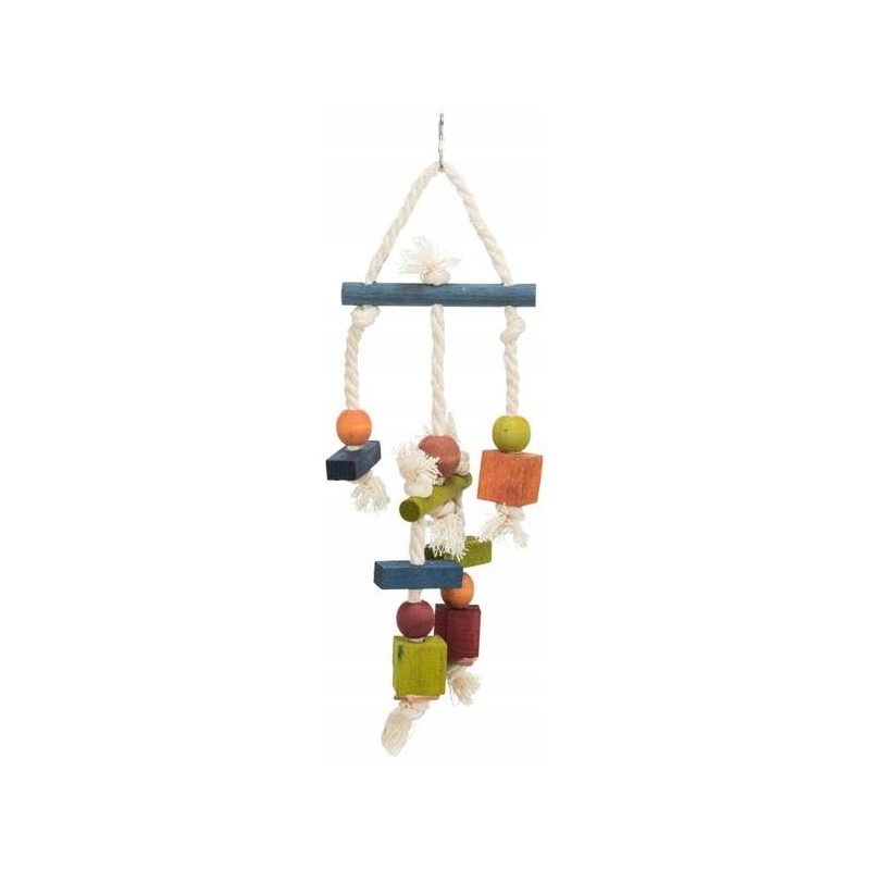 Kluczową zaletą tej zabawki jest jej budowa z naturalnych, bezpiecznych materiałów. Wykonana jest z drewna, które ptaki uwielbiają obgryzać i rozłupywać, co stanowi doskonałe ćwiczenie dla dzioba oraz pomaga w jego naturalnym ścieraniu. Zawieszona w klatce lub wolierze, zachęca do wspinaczki, manipulacji i eksploracji, oferując wartościowe urozmaicenie środowiska.