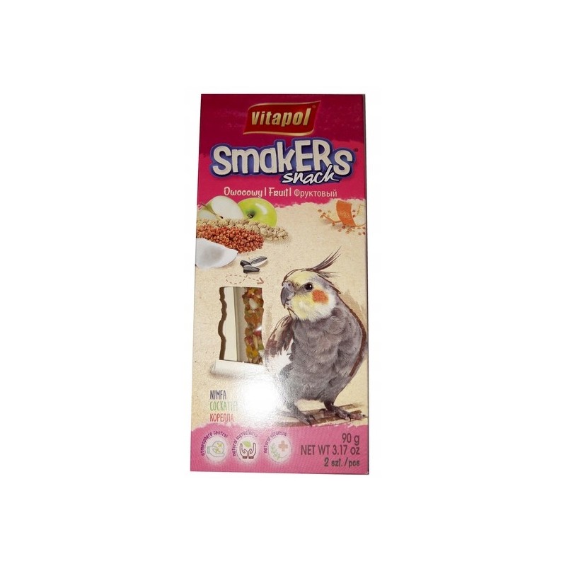 VITAPOL Smakers dla nimfy to specjalistyczny pokarm uzupełniający w formie miękkich dropsów, przeznaczony dla papużek falistych, nimf i innych małych papug. Jego owocowy smak ma zachęcić ptaki do urozmaicenia diety.