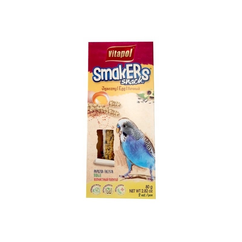 Smakers dla papużki jajeczny od Vitapol to dwie kostki smakowe, które stanowią wartościowe urozmaicenie diety małych ptaków. Produkt ma formę twardych, białych kostek, które można zawiesić w klatce, zapewniając pupilowi zarówno pożywną przekąskę, jak i zajęcie wspierające naturalny instynkt dziobania.