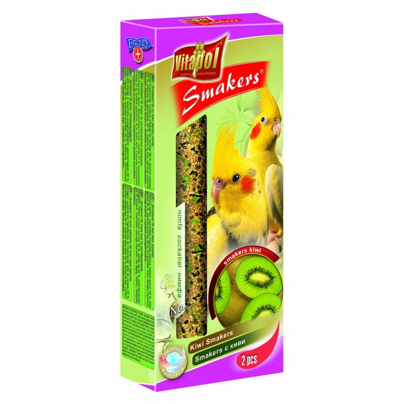 Specjalistyczna karma dla ryb akwariowych VITAPOL Smakers dla nimfy-kiwi to wysokiej jakości pokarm w formie wygodnych, dwustronnych pałeczek. Przeznaczony jest przede wszystkim dla popularnych papuzic (inaczej: pielęgnic papuzich) oraz innych średnich i dużych ryb roślinożernych oraz wszystkożernych, takich jak niektóre zbrojniki, molinezje czy skalary.