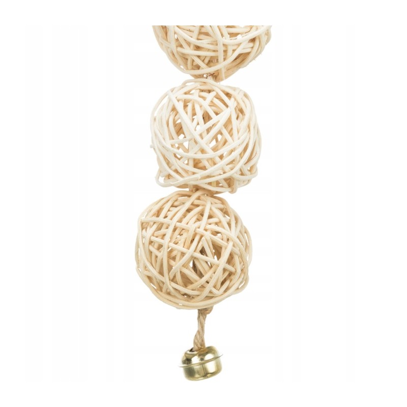 Głównym elementem zabawki są dwie kule o średnicy około 24 cm, wykonane z giętkich, wytrzymałych prętów rattanowych. Ich splot pozostawia atrakcyjne szczeliny, idealne do wciskania dzioba i chwytania. Pomiędzy kulami zamontowany jest metalowy dzwonek, którego delikatny dźwięk dodatkowo przyciąga uwagę ptaka i może stanowić zachętę do interakcji. Całość połączona jest solidnym, bezpiecznym łańcuszkiem z karabińczykiem, umożliwiającym łatwe zawieszenie w klatce lub wolierze.