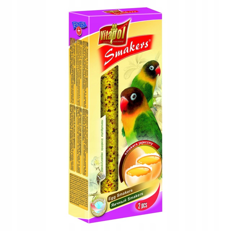 Smakers dla nierozłączek-jajeczny VITAPOL to specjalnie skomponowana, pełnowartościowa przekąska, która urozmaica dietę tych energicznych, małych papug. Produkt ma formę twardego biszkoptu o atrakcyjnym, jajecznym smaku, który zachęca ptaki do skubania, zapewniając im jednocześnie pożywną i długotrwałą rozrywkę.