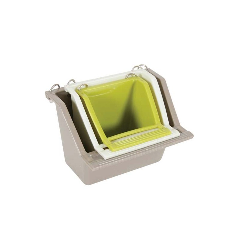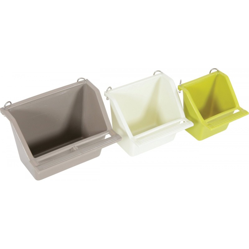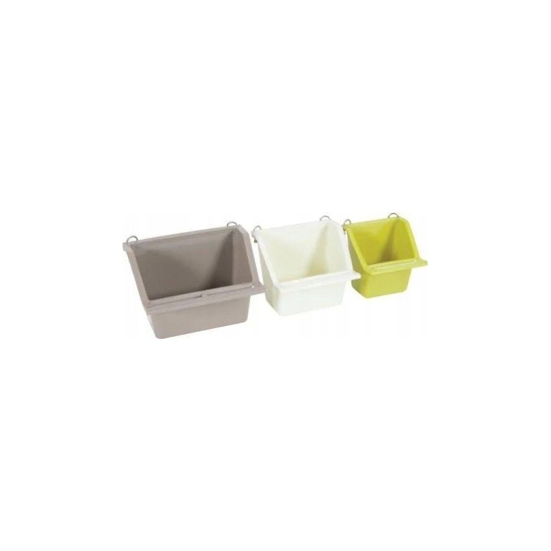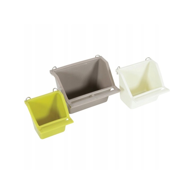 Produkt został wykonany z wytrzymałego, nietoksycznego tworzywa sztucznego, które jest łatwe do utrzymania w czystości. Jego konstrukcja minimalizuje rozsypywanie się ziaren i innych pokarmów sypkich poza karmnik, co pomaga w utrzymaniu porządku w klatce. Pojemnik na pokarm ma pojemność około 0,1 litra, co jest optymalną wielkością dla średnich gatunków ptaków, takich jak papużki faliste, nimfy czy małe papugi.
