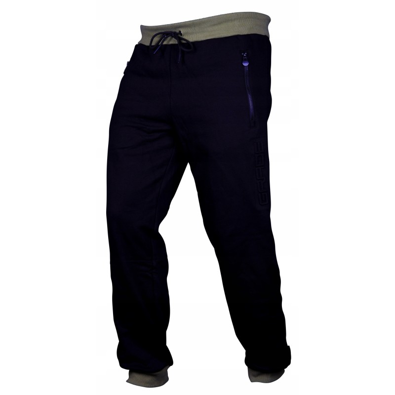 Wygodne spodnie typu joggers w czarnej kolorystyce z zielonymi wstawkami. Spodnie posiadają elastyczny pas z regulacją sznurkiem oraz elastyczne, pręgowane mankiety przy kostkach. Dwie kieszenie zapinane na zamek,