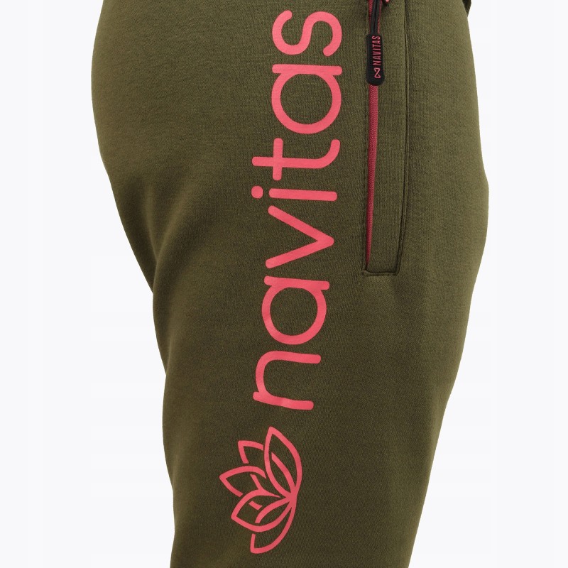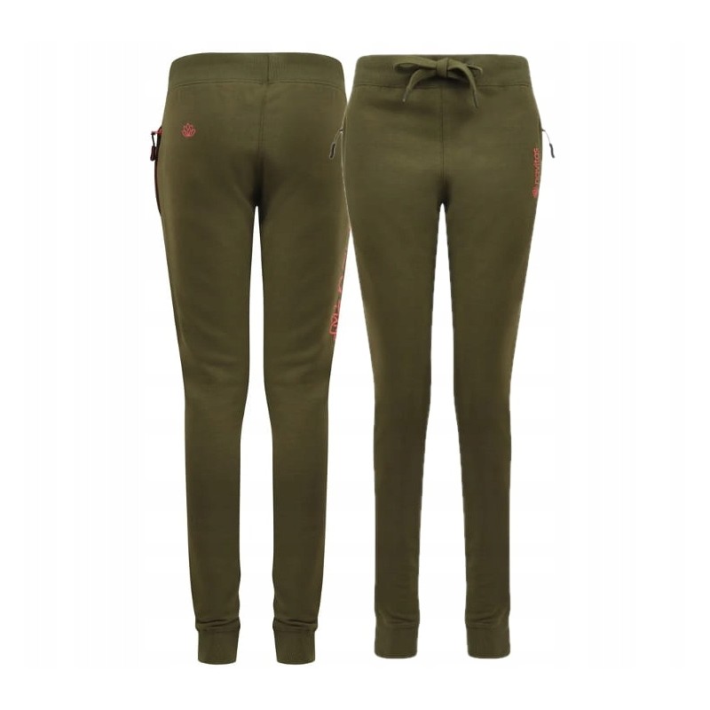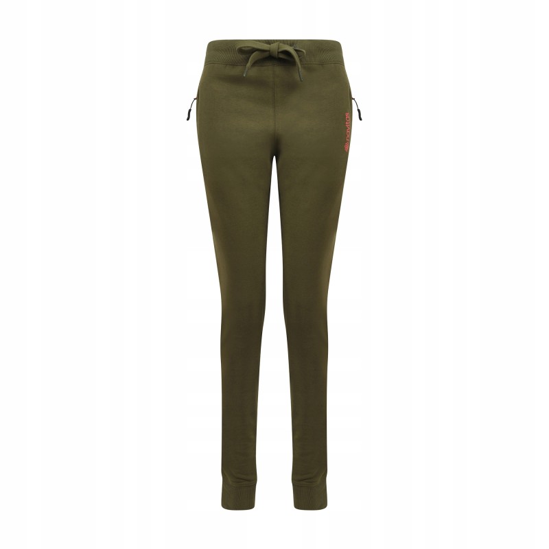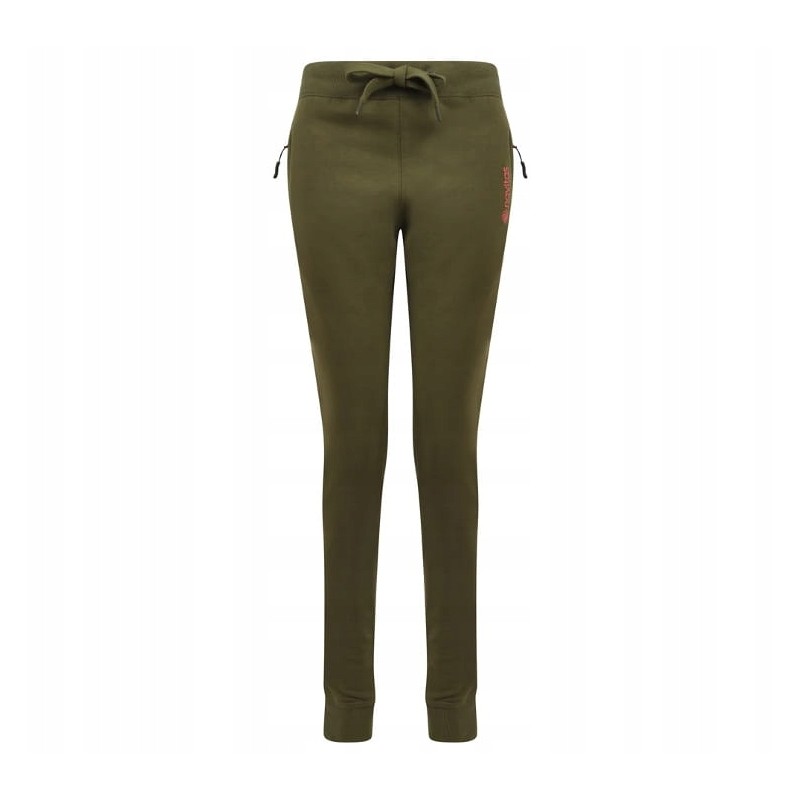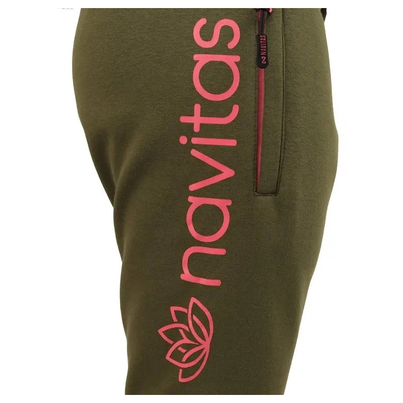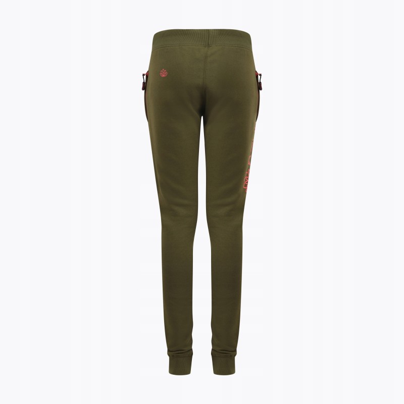 Joggery Lily uszyte z super miękkiej mieszanki bawełny w dopasowanym kroju, ze ściągaczem w pasie, kieszeniami na suwak, wąskimi mankietami na kostkach i ikoną kwiatu lotosu „Lily” i brandingiem na nogawce.