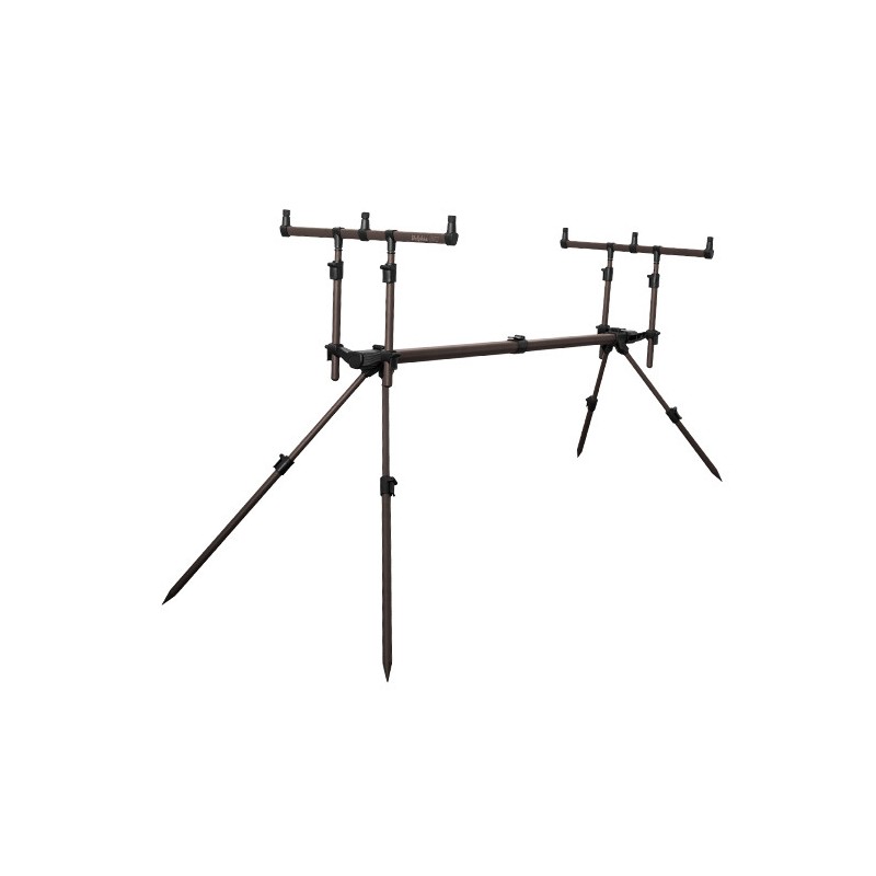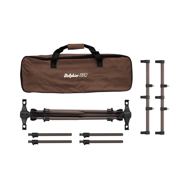 Wyjątkowy model rod poda, który łączy w sobie nieskończenie wiele modyfikacji wymiarowych. W porównaniu z klasyczną dwukierunkową regulacją nóg w lub wysokością samych buzz barów, stojak ten posiada dodatkowo możliwość przesuwania osiowego nóg. Dzięki temu użytkownik może przenieść swoją bazę wszędzie tam, gdzie mu odpowiada, w zależności od terenu. Istnieje również możliwość regulacji długości rod poda. Model do BBQ jest bardzo stabilny a każdy jego szczegół jest doskonale opracowany. Podstawa szkieletu wykonana jest z profili aluminiowych łączonych za pomocą mocnego tworzywa ABS. Każdy element konstrukcji został przetestowany pod kątem wielu cykli otwierania / zamykania. Niezwykle długie nogi teleskopowe są również niekonwencjonalne, dzięki czemu model ten m można podnieść o poziom wyżej w porównaniudo standardowych modeli. Dzięki swojej wszechstronności wymiarowej można z niego zrobić niski, kompaktowy stojak. Model BBQ cechuje bardzo niska waga i idealne wymiary transportowe. Częścią zestawu jest pokrowiec transportowy z piankowym wypełnieniem.