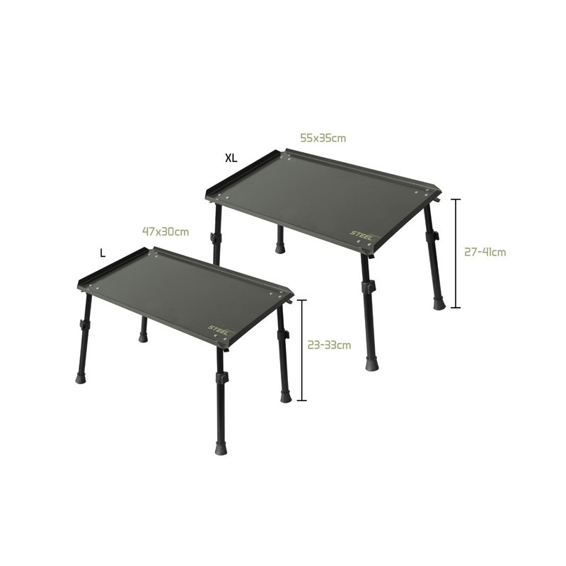 Wytrzymały i praktyczny stół STEELS może być używany do oprawiania, a także do porannej kawy na biwaku lub wieczornego grilla. Metalowy blat ma wymiary 47 x 30 cm (wersja L) lub 55 x 35 cm (wersja XL). Narożniki stołu są otwarte, aby lepiej odprowadzić wodę, jeśli stół przypadkowo zostanie pozostawiony rozłożony podczas deszczu. STEELS ma solidne nogi teleskopowe. Regulowana wysokość stołu wynosi między 23-33 cm (wersja L) lub 27-41 cm (wersja XL). Nogi można „zablokować” specjalnym mechanizmem, aby zapobiec niepożądanemu wywróceniu się stołu. Nogi są gumowane. Stół jest wyposażony w torbę do przenoszenia.