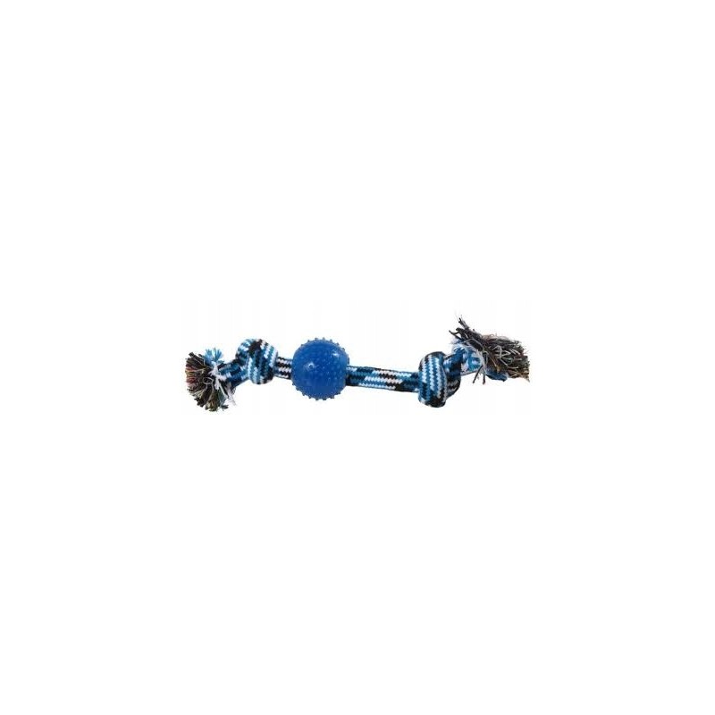 Na jednym z końców sznura mocno przyszyta jest niebieska, tekstylna piłka. Jej miękka, ale wytrzymała konstrukcja sprawia, że pies może ją chwytać, aportować lub po prostu się nią bawić. Połączenie dwóch różnych faktur – szorstkiego sznura i gładkiej piłki – dostarcza psu ciekawe doznania sensoryczne i urozmaica zabawę.