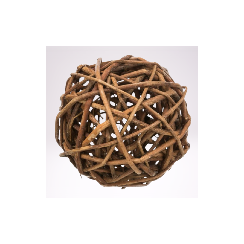 Piłka ma średnicę około 10 cm, co czyni ją odpowiednią dla zwierząt małych i średnich. Jej lekka konstrukcja pozwala na łatwe manipulowanie nią nawet mniejszymi łapkami. Z czasem, pod wpływem gryzienia, wiklinowe pręciki zaczynają się delikatnie rozdzielać, co może dodatkowo wzbudzić ciekawość zwierzaka. To produkt jednoczęściowy, prosty w formie, który sprawdza się jako samodzielna zabawka lub może być uzupełnieniem bardziej złożonych konstrukcji czy paśników.