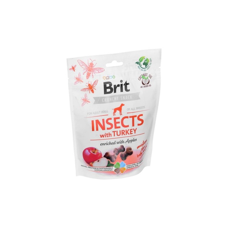 Brit Crunchy cracker insect /indyk 200g to sucha, chrupiąca przekąska dla psów, która łączy w sobie smak owadów z dodatkiem indyka. Produkt stanowi nowoczesną i zrównoważoną alternatywę dla tradycyjnych smakołyków, odpowiadając na rosnące zainteresowanie karmami bazującymi na białku owadzim.