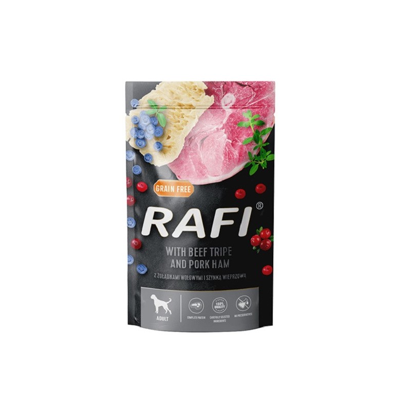 Karma RAFI w saszetce oferuje wygodę podania – po otwarciu gotowa jest do spożycia, a jej wilgotna konsystencja sprawdza się zarówno jako samodzielny posiłek, jak i aromatyczny dodatek mieszany z suchą karmą, który może zachęcić do jedzenia niejadków. Opakowanie 500g jest poręczne i pozwala na łatwe dozowanie.