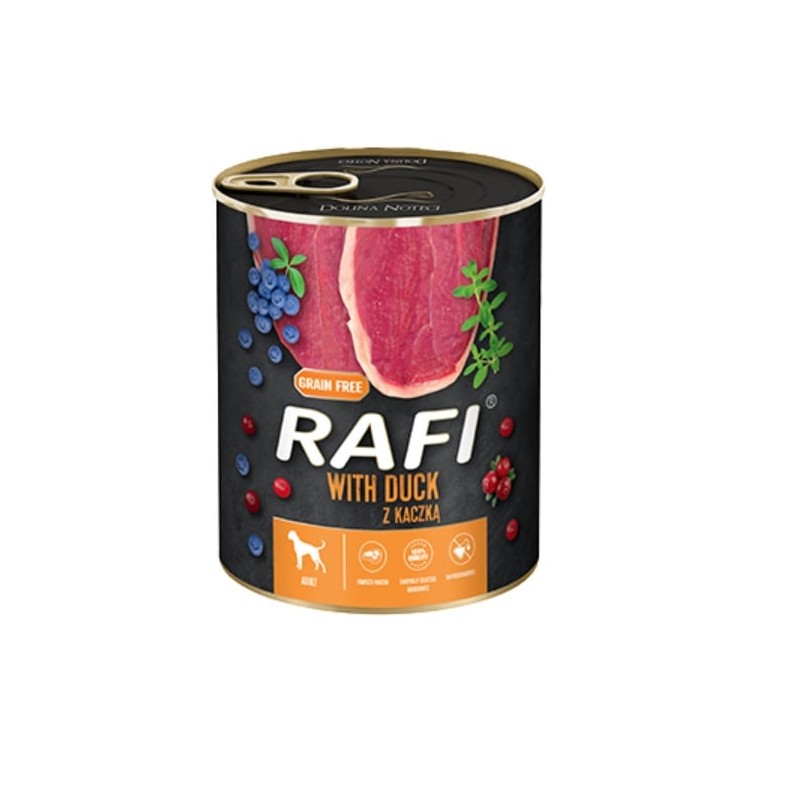 Specjalistyczna karma RAFI z kaczką, borówką i żurawiną marki Dolina Noteci to sucha karma bezzbożowa, stworzona z myślą o psach wymagających diety o ograniczonej liczbie składników lub wrażliwych na bardziej powszechne źródła białka. Jej receptura opiera się na pojedynczym, łatwostrawnym białku zwierzęcym, którym jest mięso kaczki.