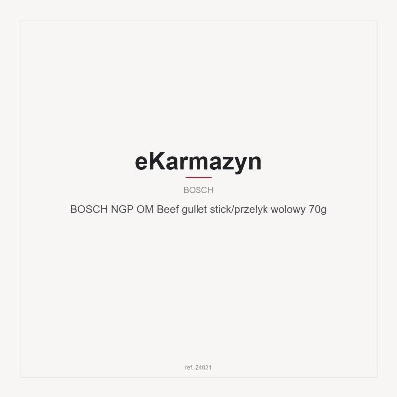 Przysmak Bosch NGP OM Beef Gullet Stick to naturalny, pojedynczy kawałek wołowego przełyku, suszony powietrzem. Produkt stanowi wyjątkowo atrakcyjne i długotrwałe źródło rozrywki dla psów wszystkich ras, wspierając jednocześnie higienę jamy ustnej poprzez mechaniczne czyszczenie zębów w trakcie gryzienia.