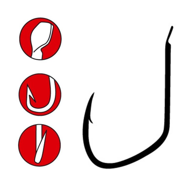 Grot jest odchylony od pionu, haczyk posiada zadzior, a grot jest niezwykle ostry.