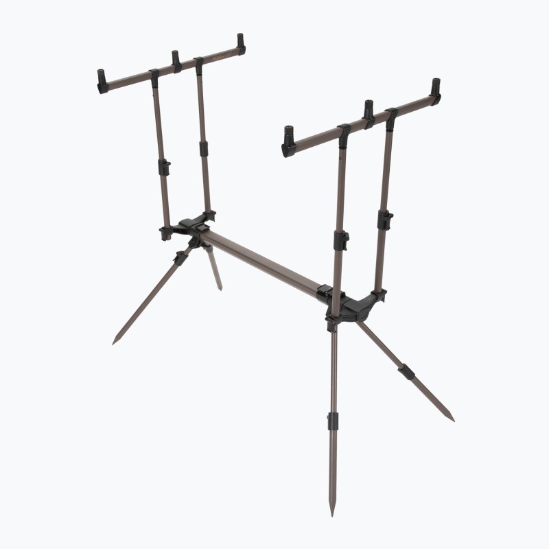 Wyjątkowy model rod poda, który łączy w sobie nieskończenie wiele modyfikacji wymiarowych. W porównaniu z klasyczną dwukierunkową regulacją nóg w lub wysokością samych buzz barów, stojak ten posiada dodatkowo możliwość przesuwania osiowego nóg. Dzięki temu użytkownik może przenieść swoją bazę wszędzie tam, gdzie mu odpowiada, w zależności od terenu. Istnieje również możliwość regulacji długości rod poda. Model do BBQ jest bardzo stabilny a każdy jego szczegół jest doskonale opracowany. Podstawa szkieletu wykonana jest z profili aluminiowych łączonych za pomocą mocnego tworzywa ABS. Każdy element konstrukcji został przetestowany pod kątem wielu cykli otwierania / zamykania. Niezwykle długie nogi teleskopowe są również niekonwencjonalne, dzięki czemu model ten m można podnieść o poziom wyżej w porównaniudo standardowych modeli. Dzięki swojej wszechstronności wymiarowej można z niego zrobić niski, kompaktowy stojak. Model BBQ cechuje bardzo niska waga i idealne wymiary transportowe. Częścią zestawu jest pokrowiec transportowy z piankowym wypełnieniem.