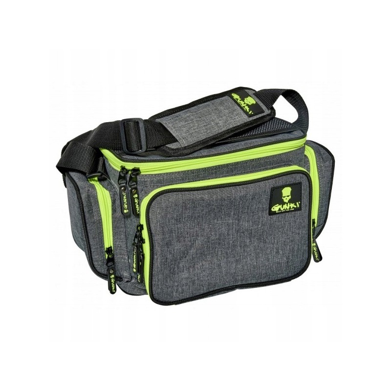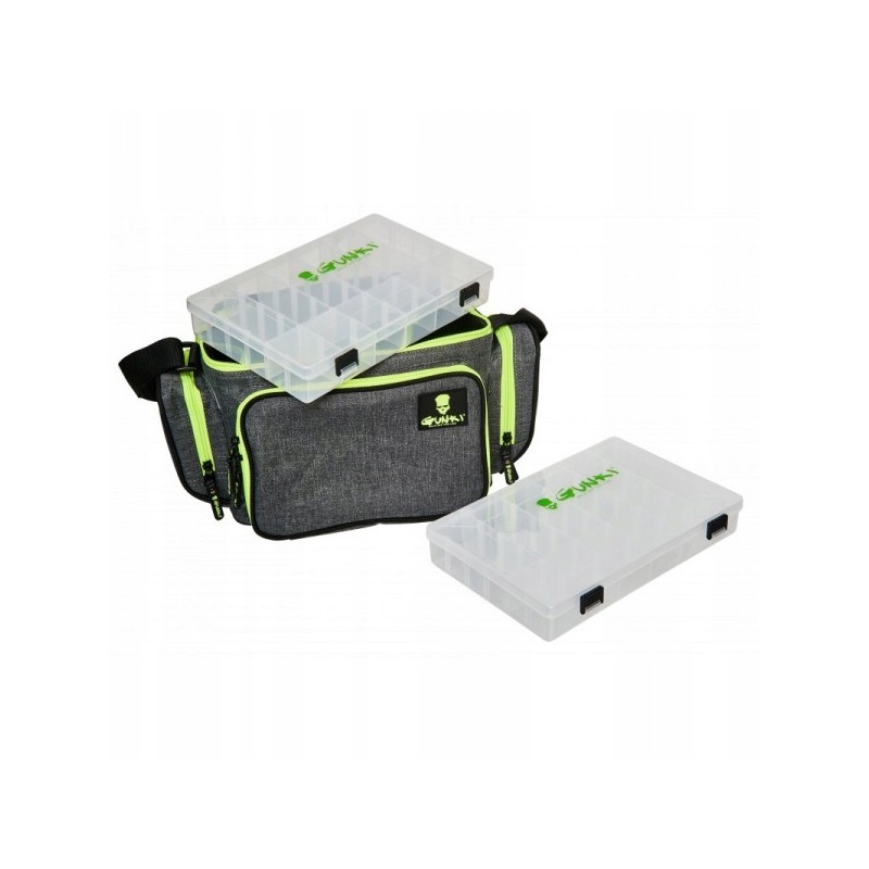 Funkcjonalna torba z dwoma pudełkami na przynęty (31,5 x 23 x 5 cm). Zaprojektowany do przenoszenia szerokiej gamy przynęt w niezbyt obszernej torbie. Górny otwór z wieloma bocznymi kieszeniami do przechowywania wszystkich akcesoriów. Wygodny pasek na ramię. Wzmocnione dno.