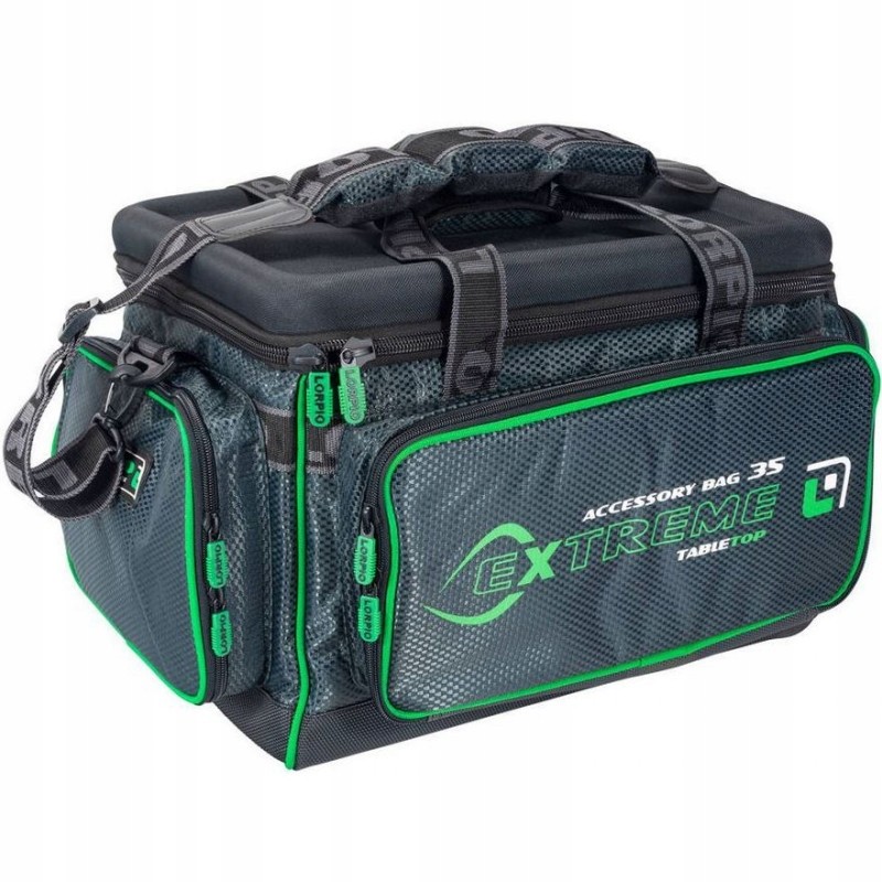 Uniwersalna torba dla wszystkich wędkarzy. Twardy dekiel oraz wewnętrzne pionowe usztywnienia zamontowane we wszystkich rogach dają możliwość wykorzystania torby jako stolik. Wszystkie wewnętrzne ściany, dno oraz dekiel wypełniony pianką dla lepszej ochrony sprzętu. Dwie boczne kieszenie oraz przednia na różne akcesoria.
