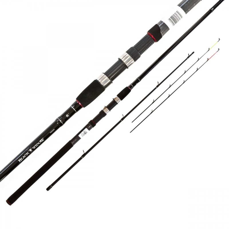 Seria wędek Black Widow Feeder firmy DAIWA oferuje szeroką gamę nowoczesnych wędzisk feederowych w rewelacyjnym stosunku ceny do jakości. Lekkie wędki feederowe o ciężarze wyrzutu 60 g, 80 g i 100 g są dostosowane do specjalnych wymagań nowoczesnego łowienia feederem. Cięższe wędki o ciężarze wyrzutu 120g i 150g oraz mocnym blanku mają większe przelotki na szczytówkach, co umożliwia wygodne stosowanie przyponów strzałowych. Idealny wybór, gdy trzeba zarzucić duże ilości zanęty w odległe miejsca. Sekcje rękojeści są pokryte wysokiej jakości materiałem niezwykle przyjemne w obsłudze, który można łatwo wyczyścić, gdy zajdzie taka potrzeba. Wyposażone w przelotki z tlenku tytanu. Wędki serii Black Widow Feeder są dostarczane z jedną czerwoną i jedną żółtą szczytówką.