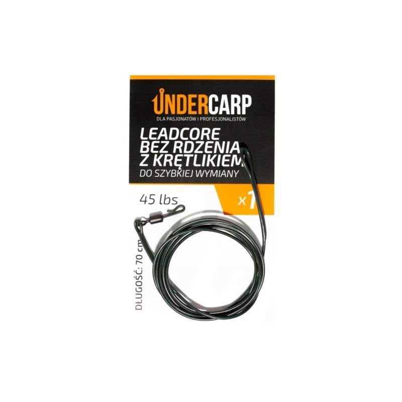 Podstawowy zestaw karpiowy wykonany z leadcoru bez rdzenia o grubości 45 lbs. Odcinek 70 cm cm zakończony z jednej strony pętlą do której przywiązujemy maszą linkę główną, natomiast druga część leadcoru została zakończona krętlikiem do szybkiej wymiany.Leadcore posiada specjalną powłokę, która dodatkowo wzmacnia odporność na przetarcia.
